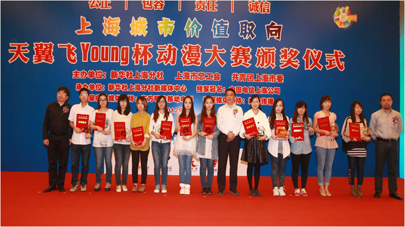 2012年9月29日下午,为期5个月的“上海城市价值取向天翼飞YOUNG杯动漫大赛”评选结果在沪揭晓,活动由新华社上海分社、上海市总工会和共青团上海市委共同举办,共有25部动漫短片从全国上千部参赛作品中脱颖而出。公司MBA06级员工王琳创作的动漫作品“诚信旺吉祥”获得“公正、包容、责任、诚信”上海城市价值取向动漫大赛三等奖,王琳创立的上海闻欣企业形象设计有限公司——“旺吉祥”团队获最佳组织奖。中共上海市委常委、市委宣传部部长杨振武,新华社副总编辑、上海分社社长慎海雄、市总工会领导、团市委领导等出席仪式并为获奖者颁奖。