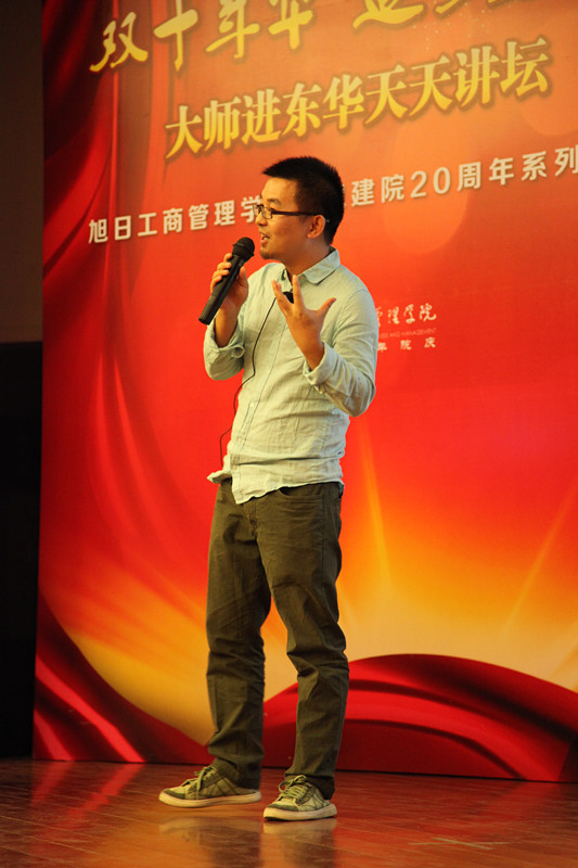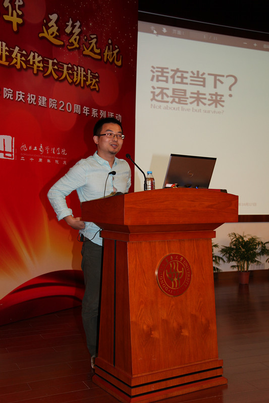 2014年10月17日晚18点30分,旭日楼400报告厅已座无虚席,来自延安路校的本科生、硕士、博士研究生、MBA员工、各界员工和部分教师共同期待着 “双十年华 逐梦远航”大师进东华天天讲坛最后一讲压轴开讲。最后一讲的主讲人成荣(洪烈)先生,现任前不久在美国震撼上市的阿里巴巴集团商务总监。成荣(洪烈)先生拥有八年传统商业从业经验,历任Baxter,Nestle等世界500企业市场经理,渠道经理等职。他于2009年加入阿里巴巴,先后担任阿里软件资深市场经理,B2B业务总监,负责SaaS软件的市场和运营,之后全面负责淘宝网生活服务、社区联盟、B2C入淘以及全网联合营销等各项电商业务。