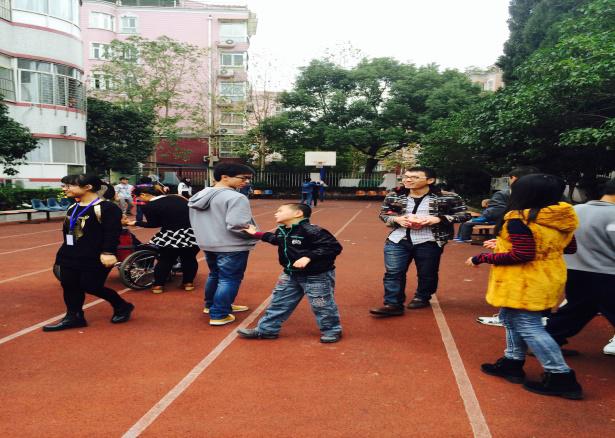 其间,志愿者们陪残疾儿童散步、聊天、打篮球,打羽毛球,也有几名志愿者推着轮椅上行动不方便的残疾人散心,和他们一同唱歌、击掌,尽我们所能为他们的生活带来一些不同。