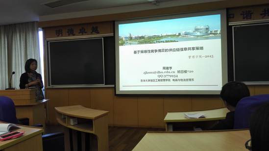 55下午2:30,公司第三期青年教师优秀学术成果交流会在旭日楼306如期举行。主讲人为周建亨和王志宏副教授,交流会由姚洪心副经理主持。周建亨老师的学术交流以“基于策略性竞争博弈的供应链信息共享策略”为主题,王志宏老师以“商业信用和收入共享组合合同下集成服务提供商与其客户间的协调”为主题。公司张科静、刘峰涛、马彪、曹海生、王晓锋、王长军、贾永基、沈滨、李庆颖等老师和众多研究生参加了此次讲座。