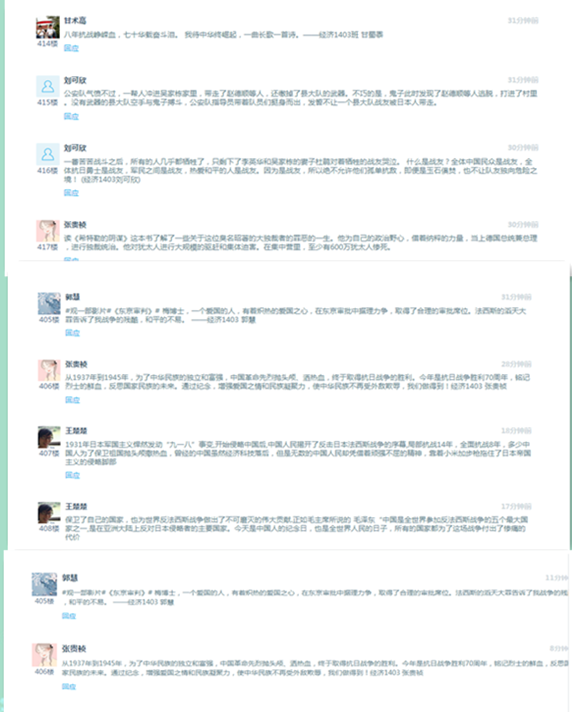 无论是党员、入党积极分子还是普通员工都积极融入到活动当中,在心灵深处缅怀先烈,感受和平来之不易。其中经济1403班团支部,班委积极组织大家参与到活动中,以实际行动来缅怀先烈。通过这次跟帖活动,经济1403班支部员工,不仅对这段历史有了深刻的认识,也对先烈们不怕牺牲的精神有了深刻感受。同时坚定了维护国家主权的意识,坚定了维护世界和平的立场,从历史的教训中感受到和平来之不易,同学们纷纷表示在以后的学习生活中要继承发扬革命先烈的精神和斗志,为建设社会主义事业而奋斗。