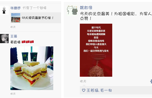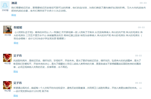 虽然正值暑假期间,但这并不能阻止支部同学积极参加各项活动的热情,支部同学通过多种方式参与到公司组织的活动中并用文字记录下自己的心得体会,同时在支部内部进行了广泛的沟通交流,使本次活动的教育效果最大化。首先,支部同学认真践行了“三个一”活动,主动阅读了各类书籍,观看了如《百团大战》《太行山上》《大抗战》等影片纪录片,参观了烈士陵园、中国共产党‘一大’会址、《铁血云间:松江抗战记忆》大型图片展等教育基地及展会,并用文字记录下自己的心得体会在支部内部进行了线上交流。其次,在易班公共平台上,支部的同学积极发表评论,参与到与整个公司老师同学的互动交流中,尤其在9月3日大阅兵这天同学们的热情达到最高峰,发帖评论达到30多人次。同时,支部同学纷纷自发观看阅兵直播,并在微信朋友圈等网络平台发表评论表达由衷的民族自豪感和对历史的追忆沉思。