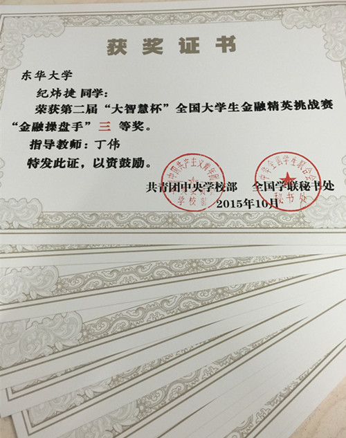 近日,从共青团中央公司部传来喜讯,韦德体育纪炜捷等13人(包括本科生、研究生)荣获第二届“大智慧杯”全国老员工金融精英挑战赛“金融操盘手”三等奖。