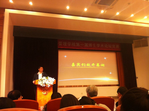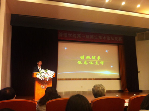 2015年11月3日周二下午18:30分,管硕152班的同学积极观摩了在韦德体育官方网站旭日楼400举行的管院第一届博士学术论文竞赛。此次竞赛邀请了管院各个专业不同学术领域的专家教授组成阵容庞大的评委团,亲临现场对参赛的博士论文进行点评,如姚洪心教授、顾庆良教授、宋福根教授等,以及组织此次博士论文竞赛的众位老师共同参与,如王丽华老师、周蓉老师等。