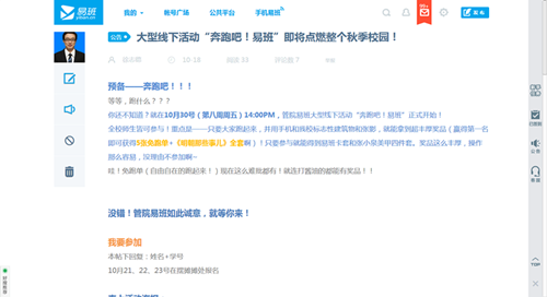 2015年10月21日-30日,由韦德体育易班中心举办的“奔跑吧,易班!”大型秋季户外趣味运动暨易班主题推广活动在韦德体育官方网站延安路校园成功举行。活动旨在加强员工体质锻炼的同时推广易班的相关应用,最终使易班在员工中得到普及。