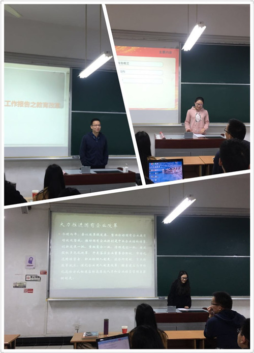 第一组同学的演讲围绕政府工作报告展开,分别阐述了政府工作报告的主要内容以及热点问题。江曼从以下从三个角度:回顾2015、部署2016、展望“十三五”规划,为大家解读了1.9万字的政府工作报告。她从新闻报道中提炼出十个关键词:经济增长预期6.5%-7%、供给侧结构性改革、新经济、扶贫攻坚、政府自身建设、反腐倡廉、重拳治污、新型城镇化、民生改善、对外开放,其后以数据和图表的生动讲解,描绘了“十三五”规划的小康目标和民生福祉。随后光善军解读了报告当中的教育改革,他列举出李克强总理发放的十个“红包”:农村孩子圆梦大学、创业带动就业、扩大高校和科研院所自主权、提高乡村教师待遇、教育公平、免除学杂费、普通本科高校向应用型转变、缓解“入园难”、关爱残障儿童、推进远程教育。最后袁方敏简单阐述了国有企业的深化改革,国有企业对供给侧改革的结构调整起着至关重要的作用,推动国企改革和供给侧改革是相辅相成、相互促进的。国企改革要为供给侧改革和整个十三五规划提供动力,国企改革是以产权为主要内容的体制改革,国企供给侧改革是以产业结构为主要内容的改革,国企改革由单纯的体制改革向产权体制与产业结构二重奏改革转变。