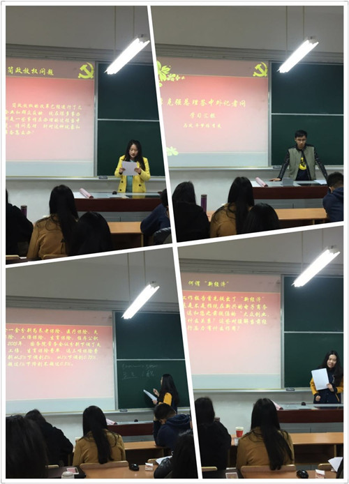 第二组肖杰杰为代表,对与民生问题紧密联系的环境问题、高校员工就业问题、外出人口问题和社会保障问题这四大热点进行了详尽的介绍。当肖杰杰提到高校员工近些年来积极主动地进行创业来带动就业的现象时,在座的所有同学都感同身受,讲述自己身边发生的一些创新创业现象,以及创业所需要的坚毅品格。同时,大家也认为创业并不一定适合所有同学,但创新创业能够为社会注入新鲜的血液,将产业联合,提供更多的人才需求岗位。