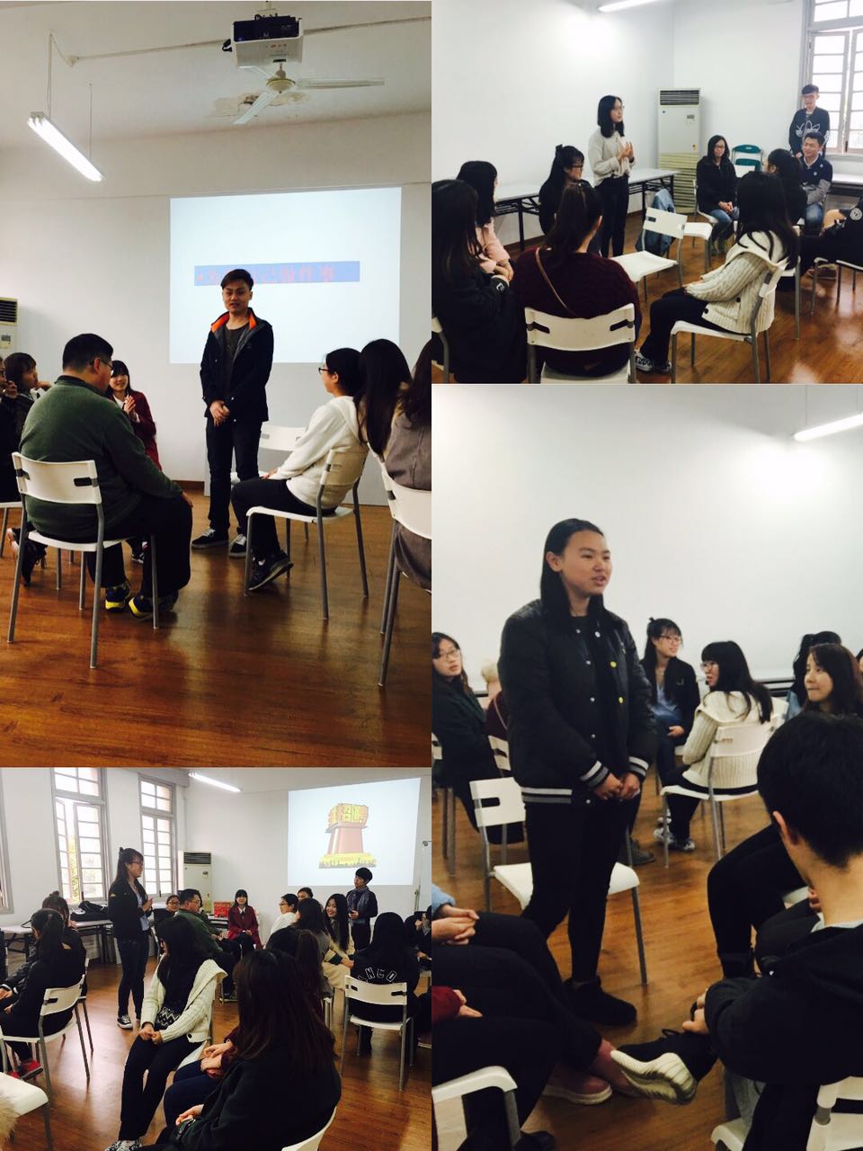 此次活动只要分为四个环节。首先王丽华老师为现已是大二的同学们,进行了定位,告知同学:大二是一个需要自我探索的一个时点。正是需要自我探索,所以王丽华老师让我们进入第一个环节——为我自己做件事。王老师安排员工分别报数并组成四个小组,每个小组围成一圈,选出下面环节的主导人物小组长,并要求每个组员进行自我介绍,介绍自身三个优点,其余作为听众的同学需要给予对方鼓励和赞美,最终再从每个小组选一个代表向全班进行自我介绍。在这个环节中,平时不太熟悉的同学们展现出了自己不被人知的却是独特的优点。第一个环节可以说作为热身,增进了同学之间的了解,也探索到自我身上的特点。