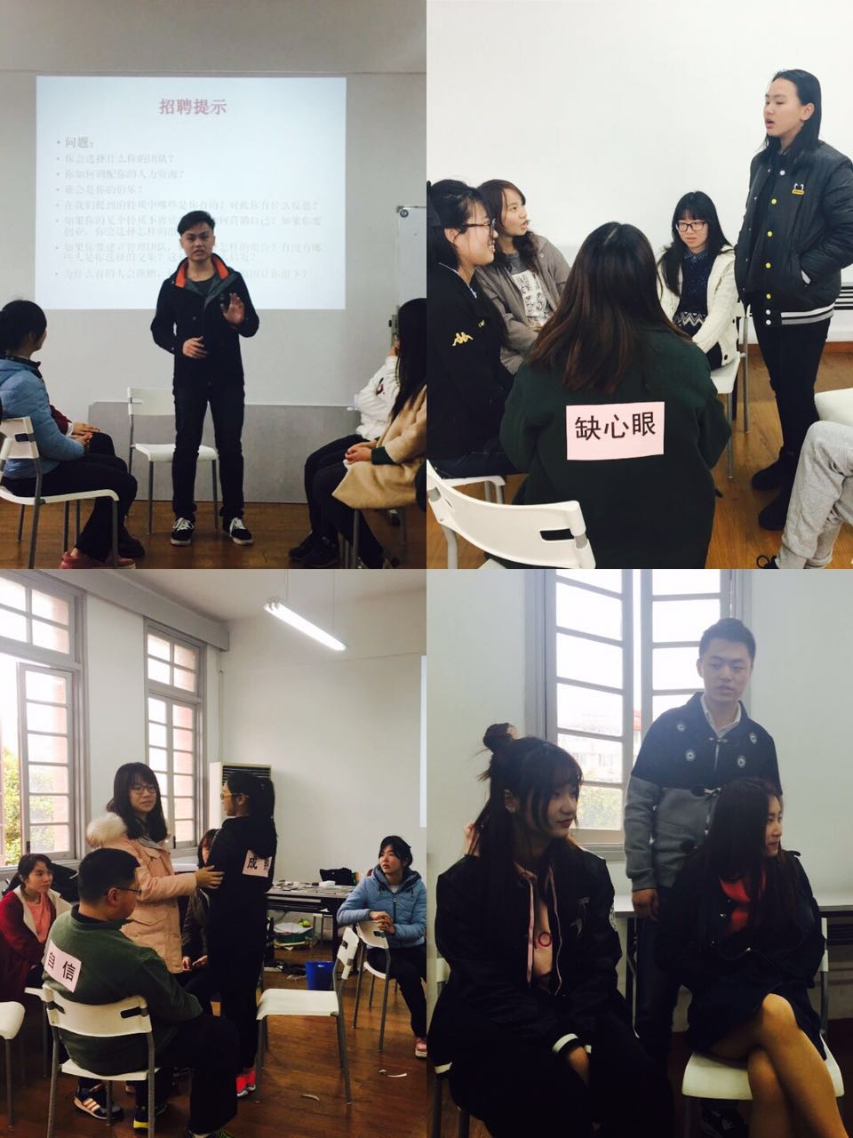 随后进入第二个环节——招聘,王老师要求除去四个组长之外的同学们背对组长围城一个圈,另外向四个组长随机分发了带有个性特点的词语的纸,需要四位组长随机给同学们贴上,被贴的同学不可以询问自己背后的特点。就这样,每个同学都被赋予了一个特点,有褒有贬,各有不同。在每位同学有了自己的“特点”之后,四位作为模拟招聘中的老板的组长可以进行员工挑选,根据同学背后的特点和自己的所需,选择适合自己公司的员工。在一次选拔之后,剩下五名员工无人问津。于是,王老师并提出了自我推销这个方法,让五位员工在四位老板面前进行一番推销,让自己能成功找到工作。有一位同学,尽管她的特点是“挑剔”,但她一番言语让在场的所有人都为她称赞:“不要想怎么做老板,要想能为老板做些什么。想老板之所想,急老板之所急。”话音一落,她就被一个老板给选中了。就这个而最后一个自我推销环节之中,可以看出一个人如何对自己定位,如何去向企业的老板进行一番与众不同的推销,也让大家体会到面对招聘会遇到的问题。