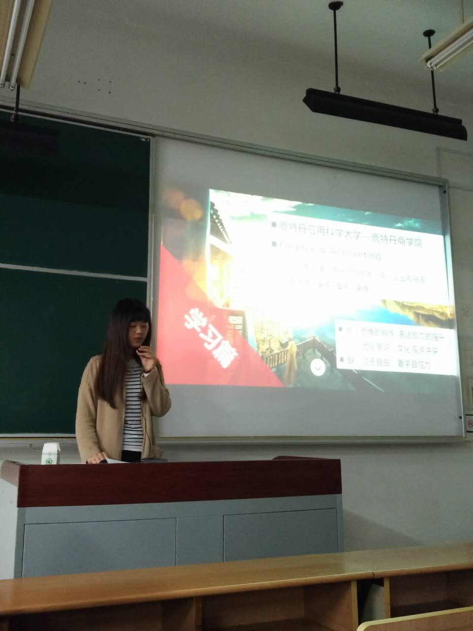 最后分享的是荷兰鹿特丹大学的王梓同学,王同学用一个小视频向我们讲述了她在荷兰的生活,表示这或许将会是她老员工活中最浓墨重彩的一笔,在场的同学们听了她的分享,对出国交换也更加期待了。