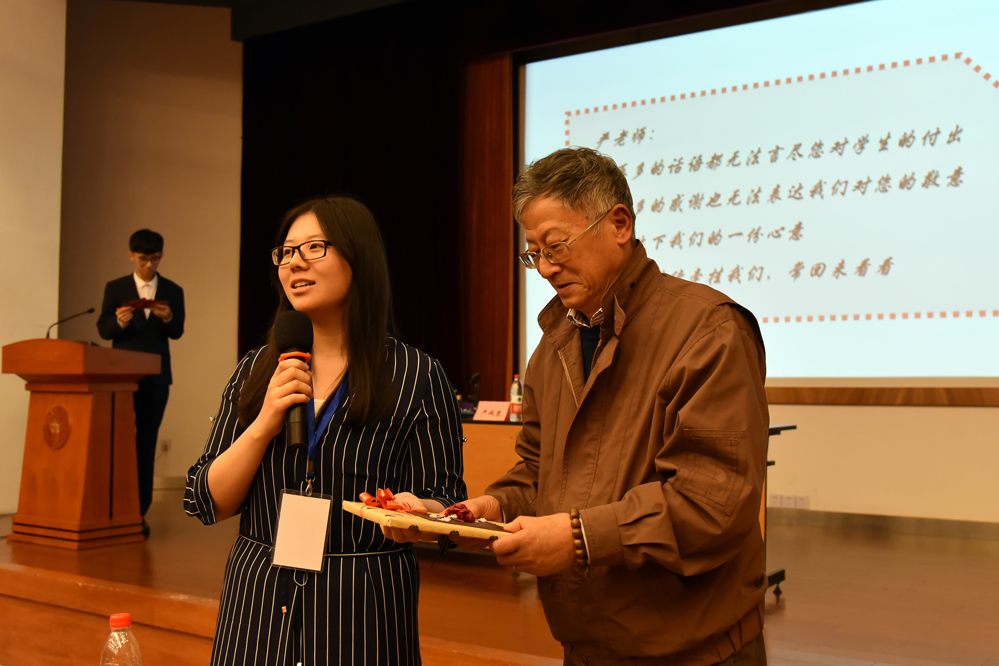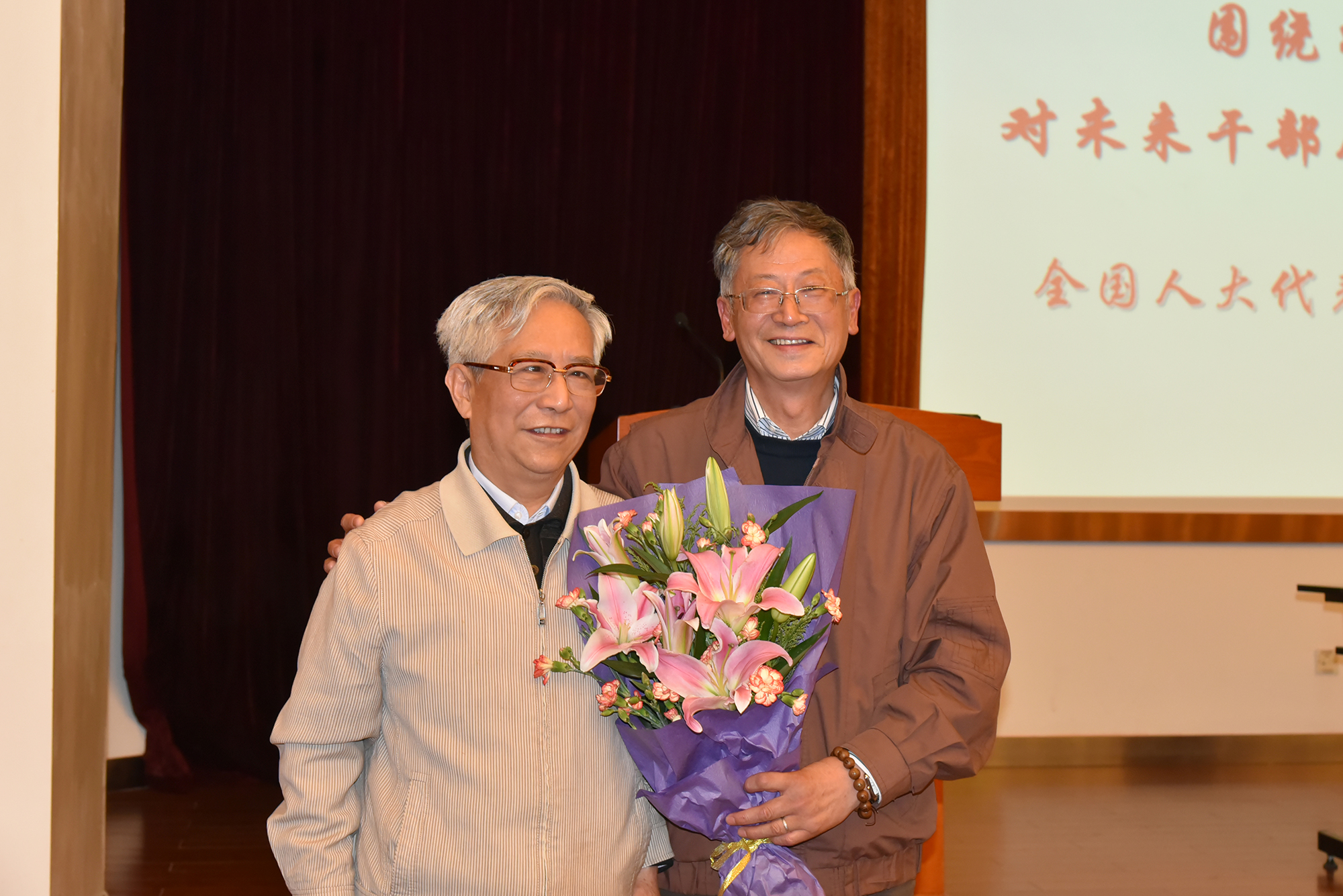 严老师的讲话一结束,嘉宾戴昌钧教授就站了起来将手中的鲜花献给严老师,严老师感人真挚地拥抱了戴教授,说起了和戴教授前辈之间的“革命情谊”。