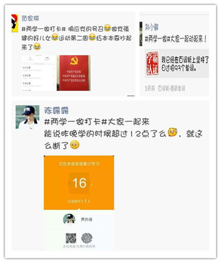 “两学一做”,贵在“知行合一”。对党章党规、系列讲话的学习,决不能成为党员自我要求的终极目标。坚持学在前、做在先,自觉坚定理想信念,练就过硬本领,勇于创新创造,矢志艰苦奋斗,锤炼高尚品格,充分发挥先锋模范和榜样作用,是合格党员应该树立的自我要求。在“做合格党员方面”,我支部党员要求每天通过微信朋友圈、微信群、微博等平台坚持记录成果与收获,其中,陈露露同志就“多说英语”软件中的所学与大家进行分享,并感慨:生活中处处都是学习,很多小事都是贵在坚持,希望我们每一位党员都能在实践中提升自我要求,成为一名光荣的共产主义接班人。