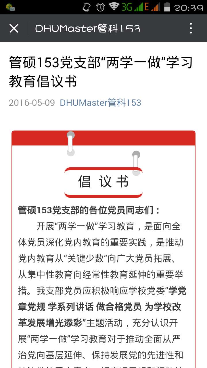 会议开始,支书张怡首先再次简述中央开展“两学一做”学习教育活动的重大意义及主要精神;同时,向大家现场宣读5月9日由我支部支委在班级微信公众号上发布的“管硕153党支部‘两学一做’学习教育倡议书”,并一再强调我支部的每一位党员都要响应中央、公司党委、本支部支委的号召,认真落实此次学习教育活动,做到知行合一。然后,在张怡同志的主持下,各位党员先后分享、交流了最近“两学一做”的相关学习、实践情况。