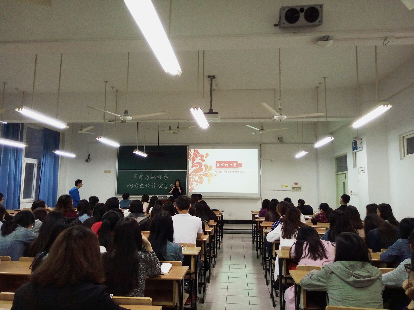 然后,选择国内外升学的2016届毕业生学姐们也给大家做了简要分享。何艳学姐拥有与众不同的老员工涯,她从一个“没长大的贪玩孩子”到勇敢参军磨练,再到无畏追梦,最终圆梦复旦,其中的不易令人赞叹。对于考研,她有的放矢地选取关键信息点给与大家指导,比如如何决定方向和目标,如何制定复习计划、把握时间等。她鼓励大家把心态放平,用努力去成就自己。韩亚男学姐已经被报送至本校研究生,她十分细致的给大家讲解了保研的政策,并结合自身经历,提出一些非常实用的建议,让向往保研的同学有了更清晰的努力方向。伍芮莹学姐即将前往瑞士理诺士国际酒店韦德体育进行深造,虽然发现在场鲜少有同学和她一样,有着在酒店业发展的志向,她还是大方分享了有关出国留学的信息,包括出国的目的以及需要注意的事项,还有需要为出国所做的各种准备等,简洁明了不失风趣。