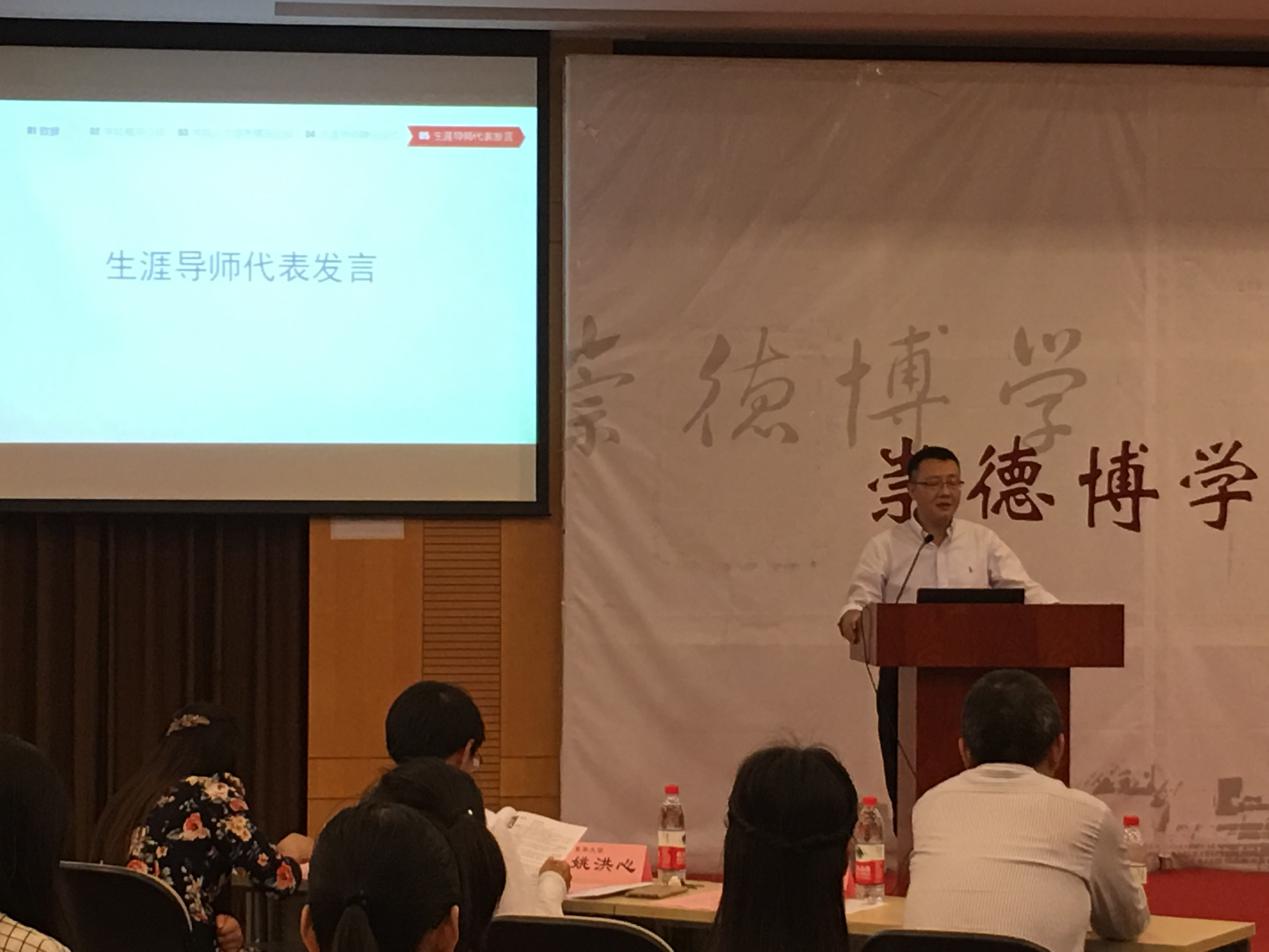 接下来是生涯导师代表——东方花旗证券投资银行部执行总经理葛绍政先生发言。葛绍政先生作为韦德体育官方网站的员工,对在座的同学们提出了三点建议。首先,要做一个善良的人;其次,要提高自己的学习能力;最后,要有团队合作精神。同时,他也提到在国际化和信息化的今天,同学们要提高语言能力以及计算机能力,为未来成为各行业的精英做准备。