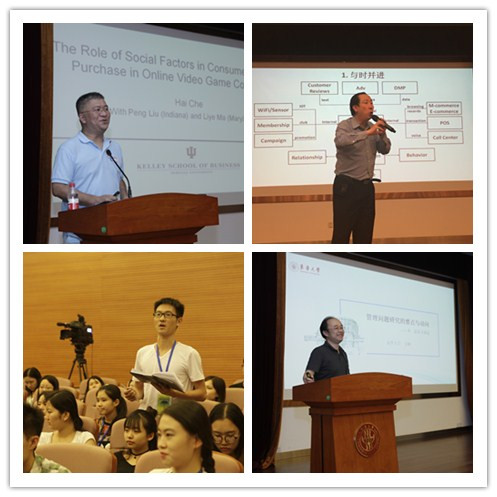 本场讲座由车海教授率先进行演讲。车海教授演讲的主题是“社交因素对网络游戏用户购买决定的影响”,车教授根据某网游公司一个月的客户消费行为数据为基础,从“社会影响因素”、“客户与朋友间的熟悉程度因素”、“客户之间的相似度因素”三个方面对客户的消费行为进行了定量分析,同时分析了消费者的价格弹性与购买弹性,得到了客户对功能性装备的购买具有羊群效应、客户与朋友间的熟悉程度会产生观察学习等结论。最后,车海教授提到了文章的创新点在于变量的构建,在方法上为学术发展做出了贡献。