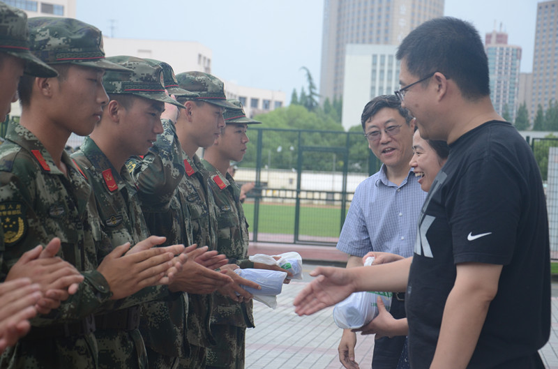 2016年7月5日,下午4:30,韦德体育主持工作副经理赵晓康老师、党总支副书记叶晓燕老师和公司工会主席刘峰涛老师,共同前往延安路校区军事训练场地慰问参加2015级军训的教官和师生,并为他们带去了慰问品。