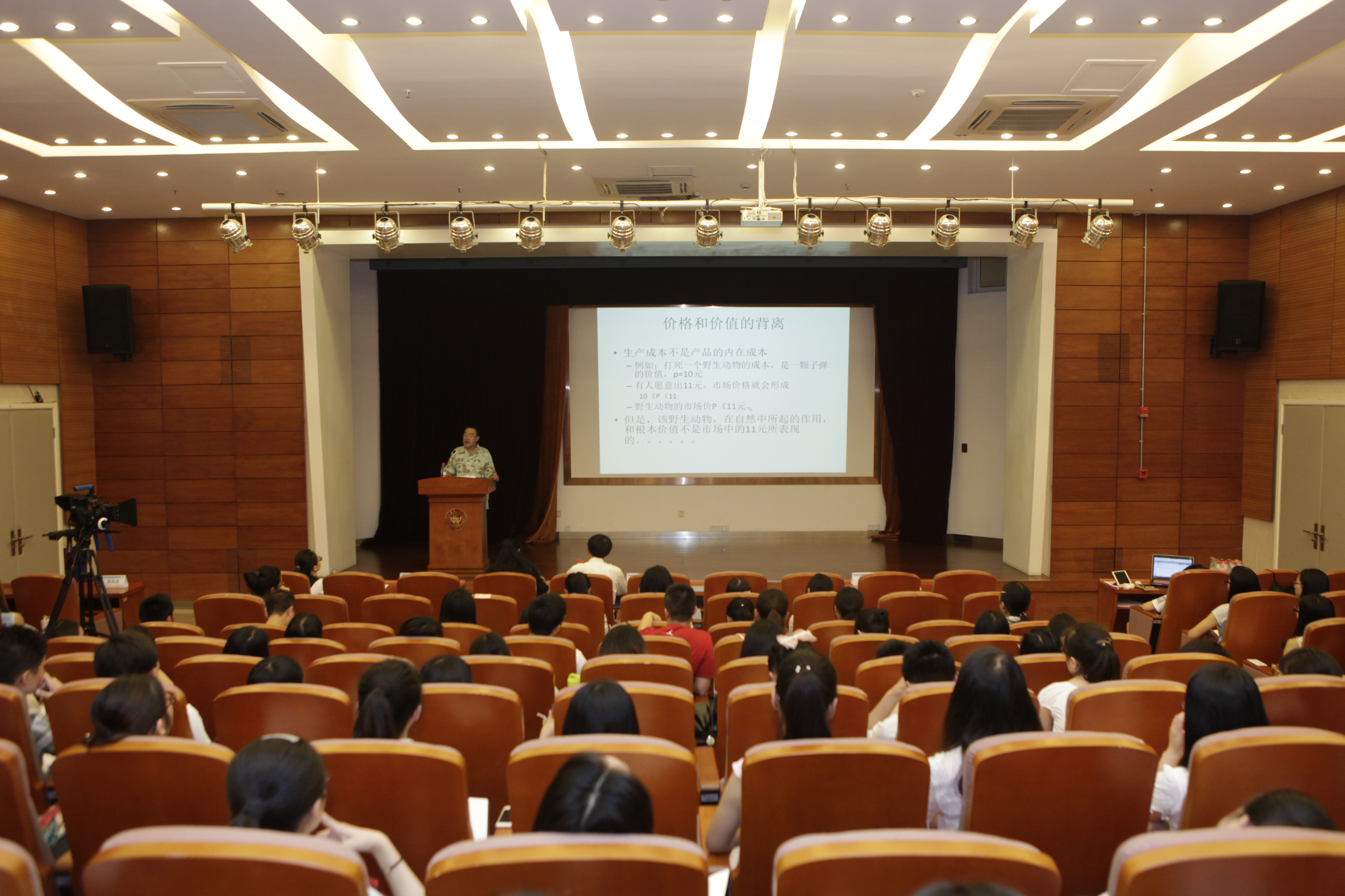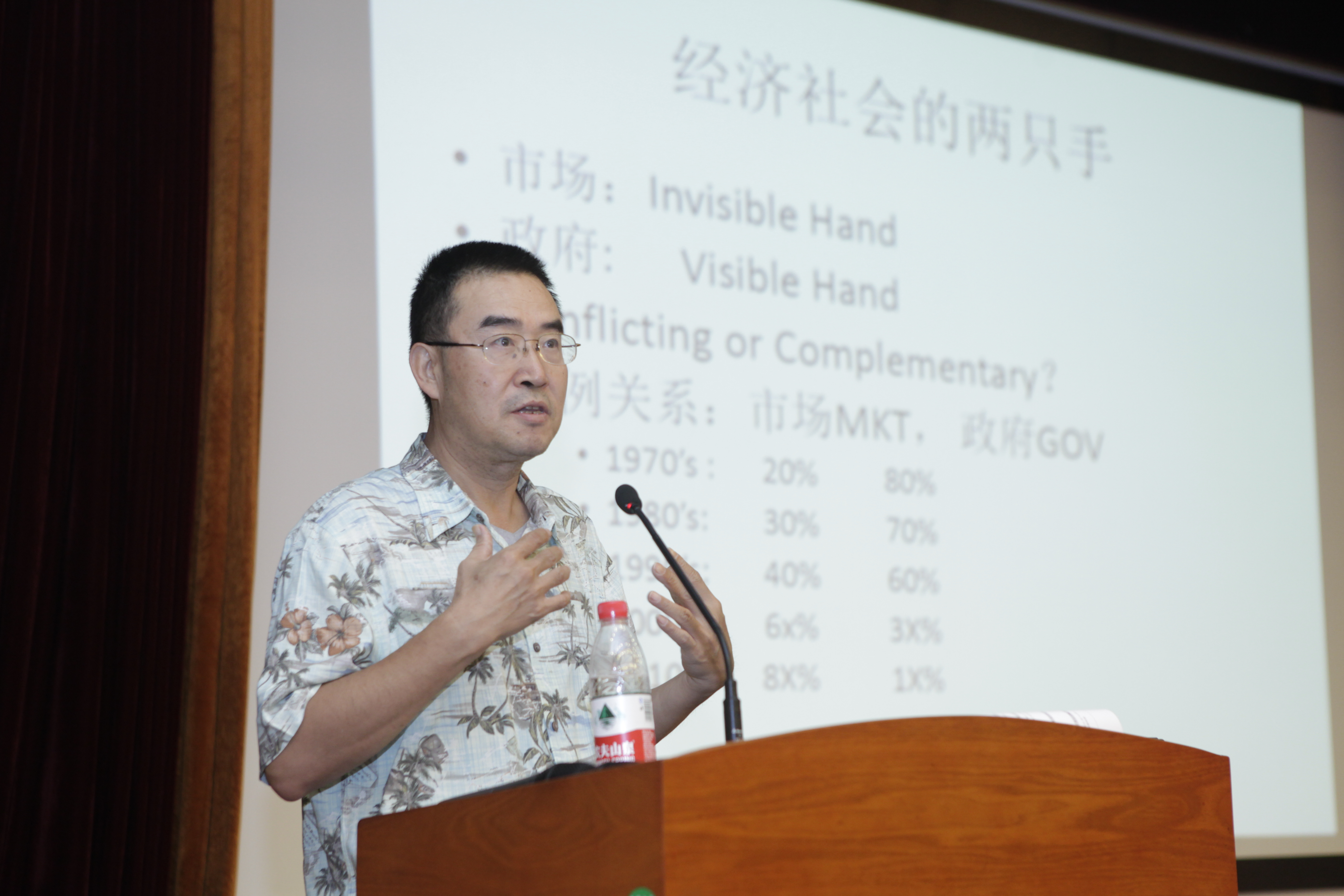 本场演讲分为两个部分,张教授的演讲主题是“市场行为及其研究方法”。首先,张教授阐释了在市场经济环境下市场和政府在资源配置环节中扮演的不同角色和二者的关系,介绍了市场的功能、市场的运行基础、市场机制的优点和缺点、市场的有效性和盲目性,以及政府的功能、政府失效的场景和资源的最优配置。张教授认为市场和政府不可偏废,应当客观评价二者的作用。随后,张教授又就在市场经济中如何分饼和公平分配展开了讨论。他用生动的例子和几何方式解释了相对公平、绝对公平和不公平的概念,又给出了经典的经济学数学推导模型,还延伸到博弈论理论,介绍了博弈论的四大元素和NASH均衡下的博弈场景。