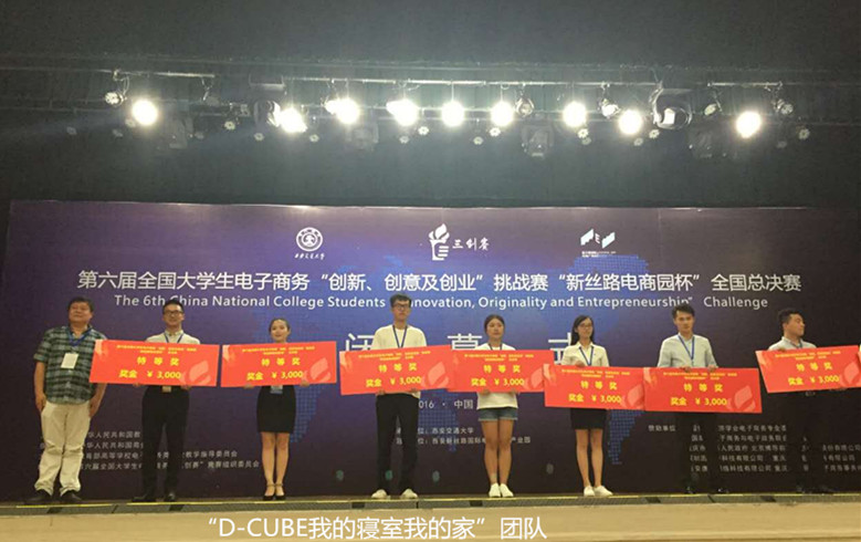 第六届全国高校“创意、创新、创业”电子商务挑战赛“新丝路电商园杯”总决赛于2016年7月20日至2016年7月22日在西安交通大学举行。由公司机械公司和韦德体育组成的团队作品“D-CUBE我的寝室我的家”(成员包括械公司工业设计韩笑、张玉杰,韦德体育国际商务许雪琼、会计学项婷婷、管理科学与工程费凯)荣获“特等奖”、“最具创意奖”,由韦德体育、计算机公司、服装公司联合出品的“OK邦”(成员包括韦德体育电子商务李晓梅、信息系统与信息管理王苑潼,计算机公司计算机技术任亮、软件工程章啸,服装公司视觉艺术牟佳慧)项目荣获二等奖,韦德体育官方网站获得“优秀组织奖”。