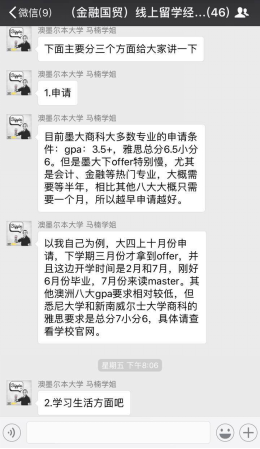 10月27日晚20点,在高加加老师以及金融三班团支书顾悦同学的共同组织下,开展了一场面向全体经济大类大三员工的留学经验分享交流会。本场交流会结合同学们的出国意向,同时兼顾国家与院校,共邀请了三位2017届经济大类专业的优秀学姐,分别为:英国伦敦国王公司的朱深深、香港城市大学的黎玉丹以及澳洲墨尔本大学的马楠。在交流会之外,还联系到了香港岭南大学的张一枫学长以及南加大的郑亦清学姐,便于在之后给同学们提供更多方向的与直系学长学姐交流学习的机会。