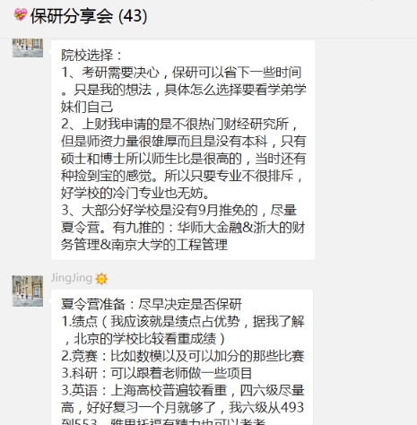 成功保研到复旦大学的张奕清学姐为大家详细介绍了夏令营,预推免,推免的区别,并回忆了复旦保研夏令营的考察流程。保入厦门大学的杨耀文学姐逐一回答了同学们的热点问题,就院校选择及专业课准备展开了系统而科学的介绍。而华东师范大学的王晶晶学姐则就尽早准备保研及综合发展个人素质分享了独道而精准的经验。近两个小时的经验分享会,同学们对保研的了解不断深入,收获颇丰!