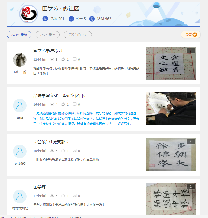 据悉国学苑是公司申请的校级易班特色项目,旨在:一、开辟院级传播中华优秀传统文化的在线平台,让更多的管院学子了解国学、学习国学,继承和发扬国学;二、提高员工的人文素养和精神情操,培养“通古博今、经天纬地”的经管精英。项目开办至今,发布话题帖201个,上传国学资料200多份,累计访问量962人次,线下活动举办十几场,累计接待员工研习活动近400人次(含本科生、研究生)。今后国学苑将购置更多学习书法技艺的书籍,以供同学们共同交流学习,同时开办了国画研习活动,不断丰富国学苑的线下活动,使更多的热爱中华优秀传统文化的员工参与进来,共同弘扬中华优秀传统文化。