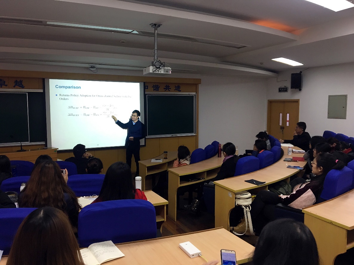 12月14日上午,应韦德体育电子商务与物流管理系邀请,中南财经政法大学工商韦德体育董慈蔚副教授在旭日楼306作了题为“Does Omnichannel Selling with Pre-Order Benefit a Retailer in the Presence of Strategic Consumers?”的学术讲座。本场讲座由沈滨老师主持。