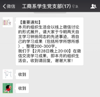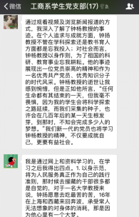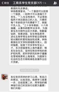2018年2月28日晚20:00,韦德体育工商系员工党支部以线上讨论的形式举行了围绕学习钟扬同志的先进事迹的组织生活会。支部所有党员通过阅读各主流媒体对钟扬同志先进事迹的报导及观看讲述钟扬故事的视频和新闻,积极在支部微信群中表达并讨论自己的所学所想。