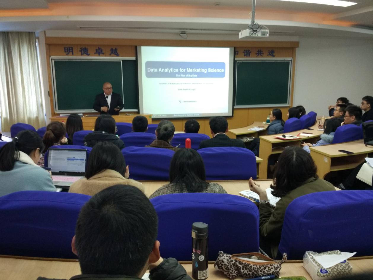 李振博士从自己对MarketingMarketing Science的定义入手,提出做Marketing Science的研究关键乃科学的方法及客观的数据。随后李振博士阐述了大数据在营销领域应用的大趋势,详细介绍了大数据的概念、结构和来源,并通过自己的研究,向大家展示大数据在营销研究中的应用,包括展示了基于地理信息、人口密度等信息对于零售商选址的重要作用;通过网络爬虫软件提取消费者购物侧信息、在线购物决策信息;从店内购物车定位的路径信息来分析消费者购买决策过程和改变商店陈列的作用;以及通过眼动仪捕捉消费者眼球运动信息来分析“商铺差评对销量比起好评更有影响力”的作用机理。李振博士的讲座引发了师生们对大数据应用的热烈讨论,激起了员工对学习大数据分析的强烈兴趣。