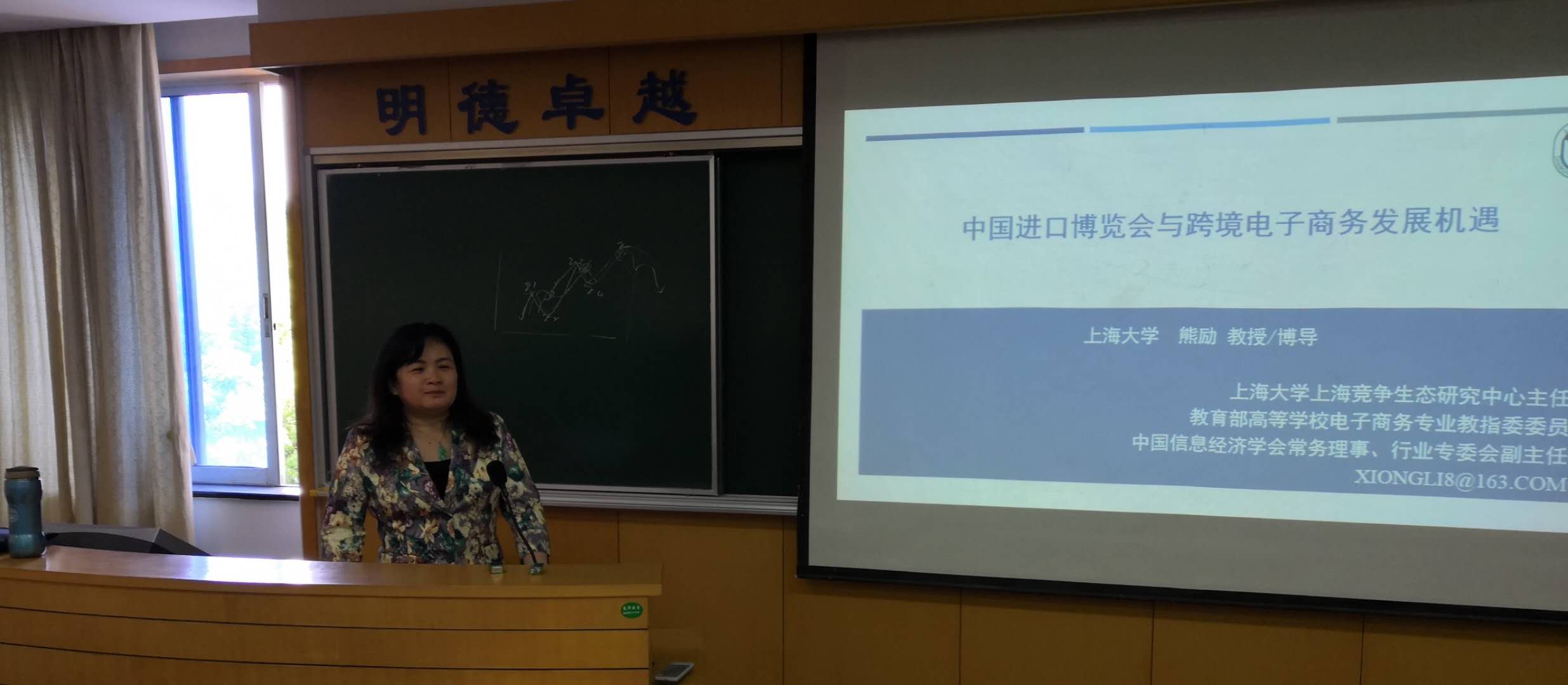 励教授介绍了互联网技术对国际贸易发展的促进作用,运用大量的数据,分析了中国跨境电子商务的发展状况,以及上海跨境电子商务发展的制约和限制。介绍了上海市政府通过中国国际进口博览会的举办,促进上海跨境电商的发展的策略。运用实际国际贸易和跨境电子商务的案例分析,对比了线下实体商务和线上电子商务的发展和促进关系。熊励教授的此次讲座给师生们留下了深刻的印象,引发了师生们对跨境电子商务发展策略的热烈讨论,激起了员工们的强烈兴趣。