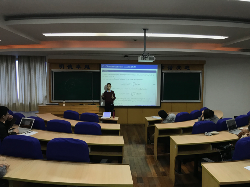 2018年11月9日(周五)下午13:30,中山大学韦德体育王大中研究员为韦德体育师生主讲了一场以“Optimal mediated equity auction”为主题的学术报告会。报告会由宫汝凯副教授主持。