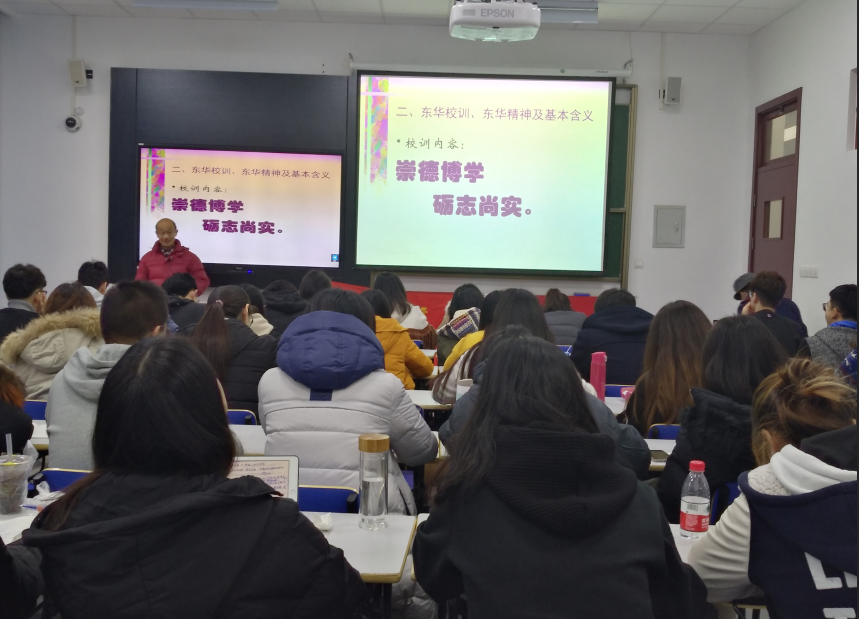 第二部分,贺教授为学员们讲解了校训和精神的基本含义。东华校训为“崇德、博学、砺志、尚实”“崇德”指崇尚有德之人,推崇高尚的德行;“博学”意指广泛的学习;“砺志”指在艰苦的环境中磨炼意志,成就事业;“尚实指脚踏实地、朴实无华的作风。东华的校训整体寓意在于激励师生修身立德、博学专攻、磨心砺志、求真求新、德才兼备。东华精神是积极向上、爱校荣校、崇尚学术、追求卓越、敬业奉献”。校训和精神是相辅相成,自成一脉的。