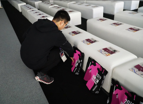 首先是整理场地。志愿者们在管理人员的指导下将桌椅摆放到正确位置,在每位来宾座位上整齐地摆放好展览的介绍,并将时尚杂志装在专用手提袋中,摆放在每个VIP座位之前,场地基本布置完毕。