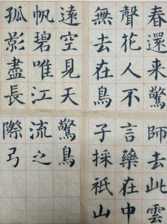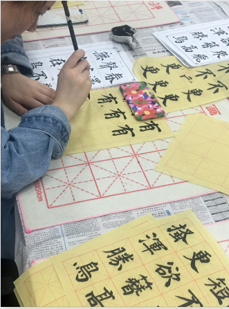在聆听徐老师介绍传统书法之后,同学们纷纷拿起毛笔开始临摹,在阵阵墨香中,走进书法世界。准备的字帖有楷书和篆书,因为大家基本都是初学者所以临摹的都是楷书,楷书章法的整体感是整齐,字的排列形式是字与字、行与行之间的等距,给人一稳定、庄重的视觉效果。点画是线条美,间架结构是局部的构图美,章法是整体构图美,方方正正的楷书,形体方正,笔画平直,可作楷模,故称“楷书”。