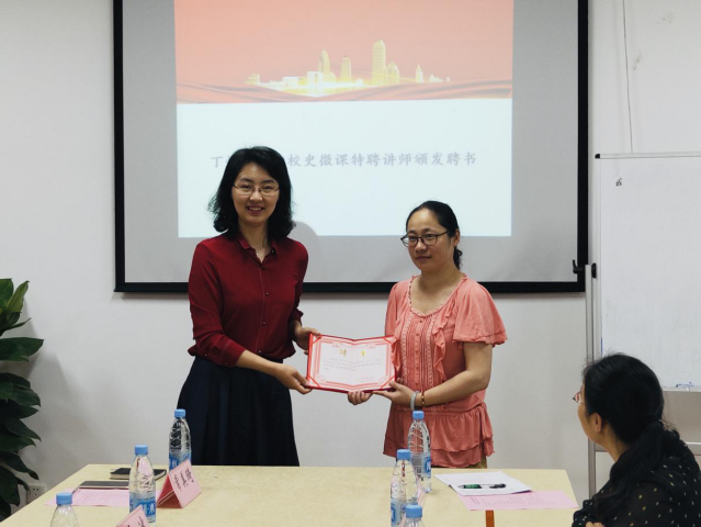 (丁怡老师向“校史微课”特聘讲师沈洁老师颁发聘书)