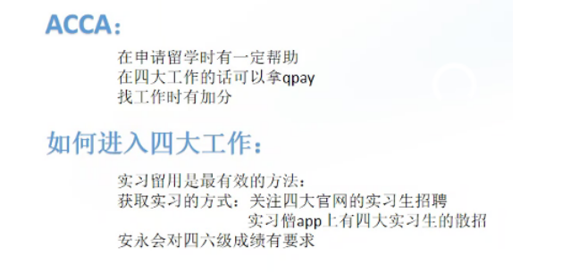 接下来,张珺男学姐——来自财管——介绍了同学们关心的ACCA对于未来职业规划的帮助,并就自己的经历分享如何进入四大工作以及实习相关的经验。