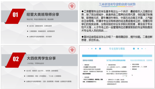 第一场为经管大类专业分流动员会,由辅导员焦美林主持。会议邀请了会计系郝莉莉、王孝钰老师,工商管理系陈驰茵、吴梦颖老师以及会展经济与旅游管理系朱丹老师五位班导师分享各专业课程、特色与前景,老师们分工明确,重点突出。郝老师与王老师详细剖析了会计与财管专业的特点,解答了员工对于考研、就业方面的困惑,鼓励员工按照个人性格与未来工作期望选择专业。陈老师与吴老师则系统阐述了市场营销与工商管理的学科基础与专业方向,建议同学们以兴趣为引导,生活为主,灵活思考。朱老师基于前期收集到的员工感兴趣的问题进行一一回应与解答,引导员工以更宽广的视野选择感兴趣并有能力表现突出的专业。除此之外,会议还邀请了经管类六大专业不同毕业去向的优秀员工分享专业学习与专业选择经验,她们从自身经历出发,详细介绍了专业填报过程、竞赛经历、考证经历、社会活动经历以及学习经验等等内容,以朋辈经历引导大一员工的生涯规划,员工们收获颇丰,反响较好。