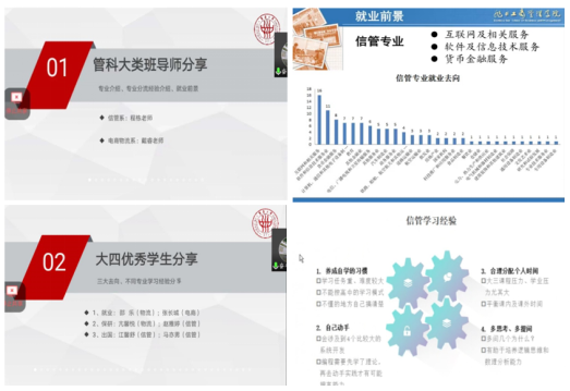 第二场为管理大类专业分流动员会,由辅导员徐志德主持。会议邀请了信息管理系程栋老师,电子商务与物流管理系戴睿老师两位班导师分享各专业的课程设置、必备技能与就业去向。两位老师列出了往年三个专业的就业率与出国深造率,鼓励员工依据个人兴趣和发展方向进行专业选择。戴老师指出:“让你与众不同的是你自己,而不是你的专业,所有的安排都是最好的安排。”引导员工在选定专业后发奋图强,选择后努力比什么都重要。之后,会议邀请了电商、物流和信管三大专业毕业去向分别为就业、推免和出国的优秀员工分享学习与实践经验,六位同学依据个人成长经历,分别分享了实习经验、推免经验与学习方法、竞赛经验、出国规划以及英语备考经验等,以亲身实践经历帮助低年级员工答疑解惑,引导员工勤奋学习,成就更好的自己。