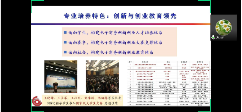 于电子商务专业,她将电商专业的培养目标总结为“虚实结合,文武双全”八个字,即理论与应用结合,管理服务知识与计算机技术并重。在介绍完优秀的团队队伍与完备的课程体系后,她向我们展示了面向员工、赛事以及社会的创新创业培养特色,表现了电子商务专业的社会服务影响力。最后,她对有独立自主创业计划或对互联网行业及电商方面工作感兴趣的同学表示欢迎。