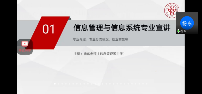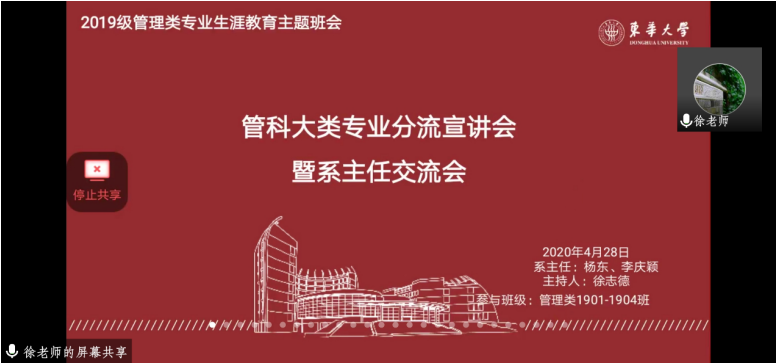 情尚未结束,工作井然有序。为了进一步帮助2019级管理类员工明确个人专业方向与生涯规划,管理类1-4班于2020年4月28日13:00在腾讯会议召开主题为“管理类专业分流宣讲会暨系主任交流会”的线上班会。班会由辅导员徐志德主持,有幸邀请到信息管理系杨东主任与电商物流系李庆颖副主任进行专业宣讲介绍。