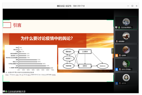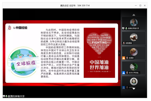 2020年5月24日19点会计系员工党支部开展了以“学理论,享感悟:牢记历史使命,做到知行合一”为主题的线上分享会,支部几十名发展对象和积极分子分为13个小组结合新冠疫情防控从“疫情中的平凡与伟大”、“疫情下对‘四个自信’的新解读”、“疫情当下的生态文明建设思考”、“疫情面前企业的责任与担当”、“全球疫情防控中的中国担当”等七大主题展开,通过组内党员同志指导、成员们收集材料,引导积极分子和发展对象对国内外由防疫产生的一系列现象和问题深入思考,认清中国共产党在防控疫情的领导作用和中国特色社会制度的显著优势,提高党性修养,增强“四个意识”坚定“四个自信”做到“两个维护”。支部党员李异同、杜晓钦主持了本次会议,并介绍了分享会的主题和流程。