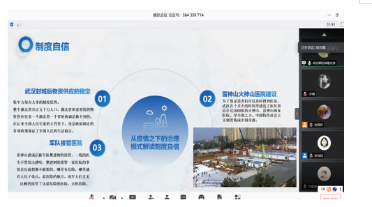 第十二组对国内外防控形势进行对比,列举了雷神山、火神山医院背后的“中国力量”,以及医者仁心、华夏儿女百折不挠的抗疫精神,深入挖掘其中的民族情怀。同时强调,作为新时代的青年应不忘初心,在积极向党组织靠拢的过程中,更应该从抗击疫情的历程中增强民族自信心和自豪感,使其汇聚成热爱祖国、建设祖国的磅礴力量。