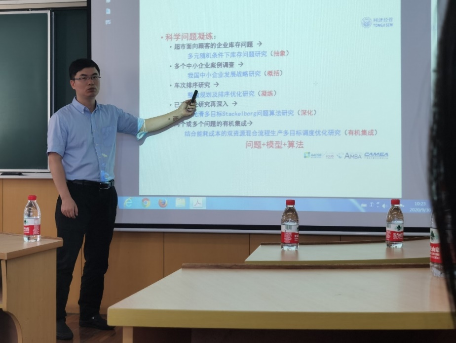 王世进副教授首先简介了自然科学基金管理科学方向项目申请流程。其次,他对基金选题、文献综述写法、参考文献数目、立论依据、研究内容、拟关键解决的问题、技术路线和研究方法、研究特色、预期成果、进展、研究基础与团队、摘要以及经费申请的撰写方法进行了详细的介绍。再次,他总结为遵循“问题+模型+算法”的主线进行撰写,他强调自然科学基金项目的申请者要打好前期的基础、撰写申请书要有逻辑、重视文本格式和质量、保持平常心和诚实守信。最后,王世进副教授认真回答了参会老师和同学的疑问。