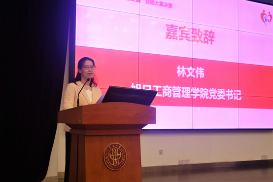 决赛伊始,管理公司党委书记林文伟为本次大赛致辞。林书记表示,公司教师一直全力推进课程思政建设,把脱贫攻坚作为国情教育的重要内容,思考“三全育人”新途径。此次“创意公益”营销大赛是青年员工参与国家脱贫攻坚工作很好的契机,鼓励同学们发挥专业本领,积极探索营销扶贫创新创效,将个人的发展融入国家奋斗目标中,成为勇担当、敢创造的时代新人。