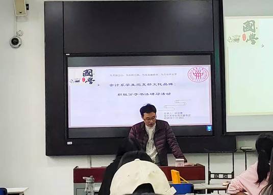 文化是一个国家、一个民族的灵魂。文化兴国运兴,文化强民族强。汉字书法作为中华文明独特的艺术形式,被誉为:无言的诗,无形的舞;无图的画,无声的乐等。为贯彻学习党的十九届五中全会精神,深入开展四史学习,坚定文化自信,弘扬中华优秀传统文化,会计系员工党支部于2020年11月24日下午13:00在一教210举办了以“研习书法,挥毫泼墨,感受中华文化底蕴”为主题的第三期会计系员工党支部积极分子书法研习活动。此次活动由会计系员工党支部书记徐志德老师主持。