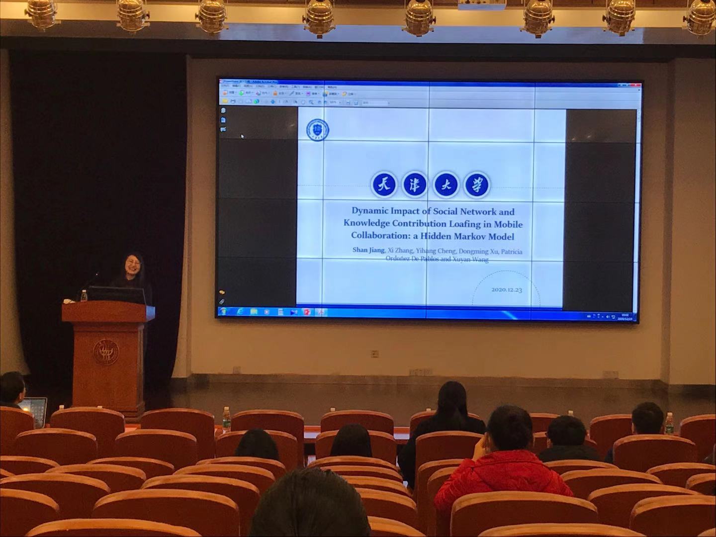 上午部分包含三场青年学者学术报告,下午部分为三场特邀的高水平学术报告。上午分享的第一位青年学者是天津大学的江珊,报告题目为“Dynamic impact of social network on knowledge contribution loafing in mobile collaboration: a hidden Markov model”,研究动态社交网络中知识贡献懈怠现象及影响机理,并运用实证方法予以解决。