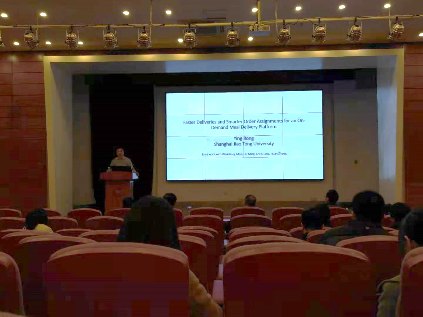 最后一位特邀嘉宾是上海交通大学的荣鹰教授。荣鹰教授获得了国家杰青、多次国际奖项,包括两度MSOM最佳论文奖和INFORMS EnergyNatural Resources & Environment Young Researcher Prize。荣鹰教授分享的题目是“Faster deliveries and smarter order assignments for an on-demand meal delivery platform”。外卖配送问题是近年来的一个研究热点,通过分析杭州外卖的一些实际数据,发现“延迟交货”对未来订单的负面影响远大于“提前交货”的正面影响。此外,骑手的个人知识和先前的送货经验可以显著减少延迟交货。最后,通过模拟研究说明了如何将经验知识结合到订单分配策略的开发中,以帮助平台有效保留客户并增长业务。