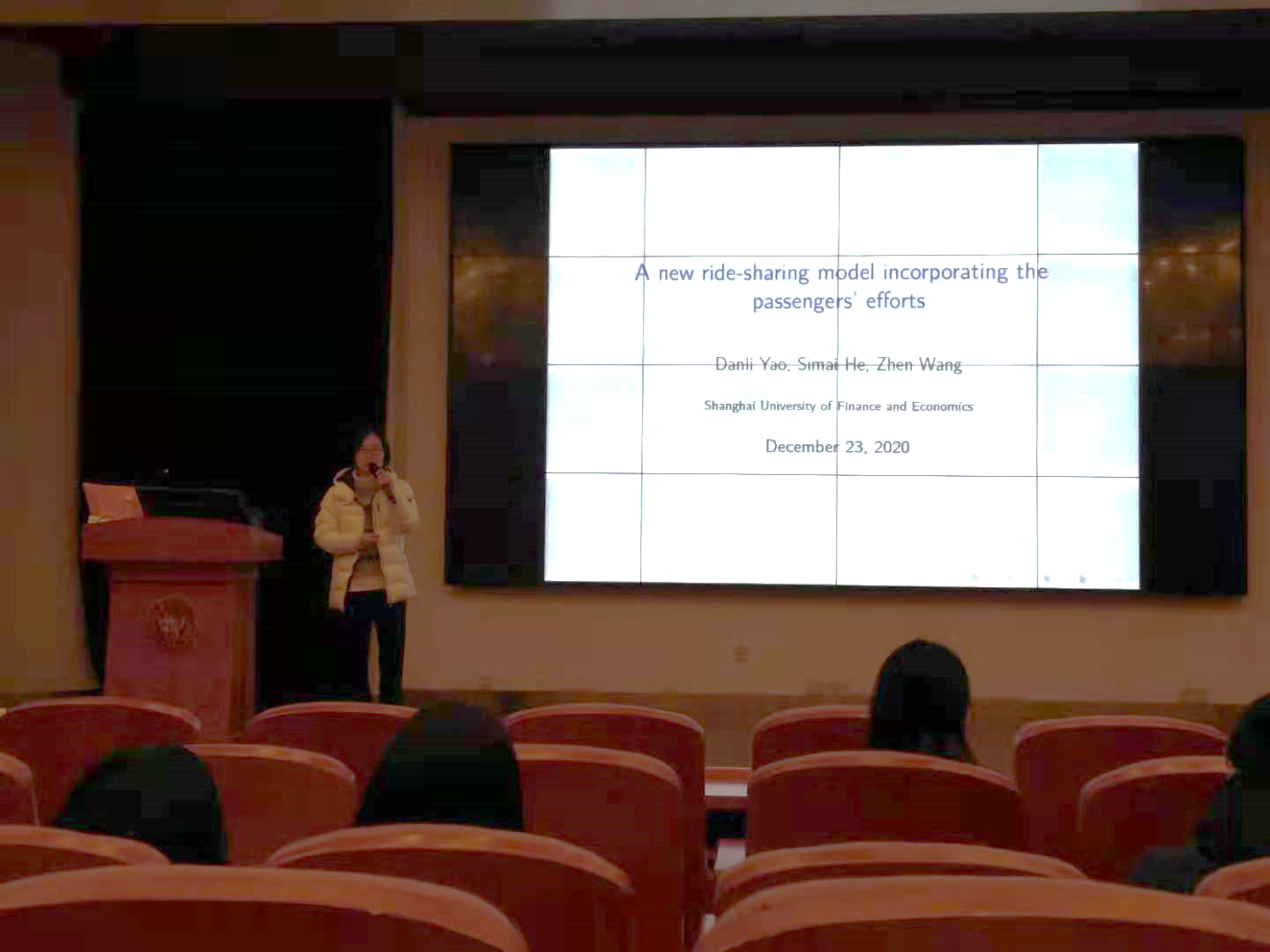 第三位青年学者是上海财经大学的姚丹丽。姚丹丽博士的报告主题是“A new ride-sharing model incorporating the passengers efforts”,主要研究对有拼车意愿的乘客如果通过调整乘客的步行距离要求来提升总体拼车成功率。