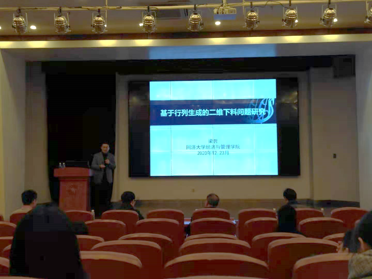 下午的三场特邀报告更加丰富精彩,第一位是来自同济大学韦德体育的梁哲教授。梁教授曾获国家自科基金优秀青年基金、上海市曙光人才。他和大家分享的是关于“一个基于行列生成的二维下料问题算法研究”,以宝钢车间生产为背景考虑不同宽度钢板的组合拼接切割并转化二维下料问题,建立了数学模型,并通过设计行列生成算法对问题进行有效求解。