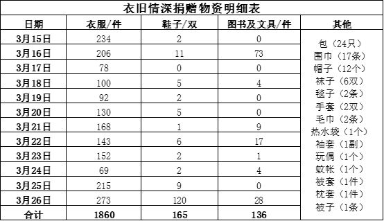 表1 “衣旧情深”爱心捐赠活动物资明细表